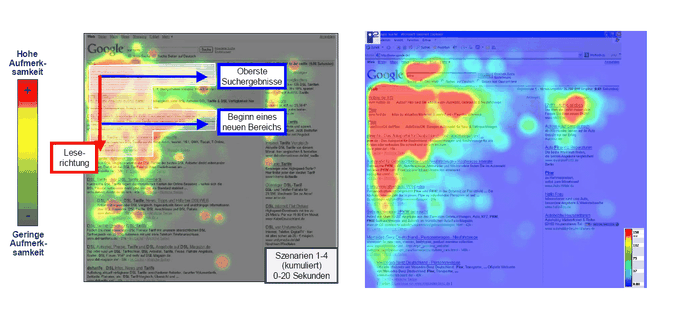 Relation Browser (BVDW) belegt eindeutig, wie wichtig es für Werbungtreibende im Internet ist, auf den Ergebnisseiten der Suchmaschinen sowohl mit den Webseiten als auch mit Suchwortanzeigen möglichst weit oben platziert zu sein. Denn die Aufmerksamkeit der Nutzer konzentriert sich auf den oberen Bereich der Seite und Anzeigen haben eine hohe Relevanz für die Kaufentscheidung. Die Betrachtungsdauer der Seite und auch die Bereitschaft zum Klick nehmen von oben nach unten ab. Nutzer orientieren sich zunächst durchgehend an den ersten drei Ergebnissen, alle anderen Elemente werden erst später betrachtet.