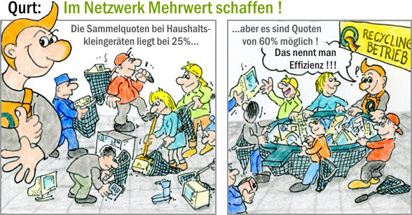 wir möchten uns als Presseansprech- und Medienpartner für das Netzwerk QuReC (Qualtät im Recycling) bei Ihnen vorstellen. Für unseren neuen Themendienst suchen wir Redaktionen und Portale als Partner. Wir liefern Ihnen jeden Monat Fakten und Hintergründ zu einem neuen Thema und eine entsprechende Comiczeichnung zur kostenlosen Veröffentlichung. QuRec (Qualtät im Recycling) ist das neue bundesweite Netzwerk von Recyclingunternehmen für elektrische und elektronische Altgeräte. QuRec entwickelt Instrumente, die Unternehmen der Recyclingwirtschaft in die Lage versetzen, Materialeffizienz durch höhere Rückgewinnungsquoten und optimierte Prozesse zu steigern. Abbildung von JARI BANAS zum freien Abdruck. Mit besten Grüßen Andreas Geil & Anja Haupt InhaltsverzeichnisInterview mit Carsten Eichert Netzwerk-Koordinator von QuRecInterview mit Carsten Eichert Netzwerk-Koordinator von QuRec 1.) Herr Eichert was sind die genauen Ziele eines Netzwerkes für Recycling? In dem Netzwerk für Recycling sollen die Wiedergewinnungsraten aus alten Produkten maximiert werden. Die Schwachen lernen von den Starken, jeder bringt eine spezifische Stärke ein, keiner ist in allen Bereichen der Beste. Das Ziel, die Prozesse der Netzwerkpartner soweit zu entwickeln, dass die eingehenden Abfallmengen zu einem Maximum an Sekundärrohstoffen recycelt werden, wird durch Austausch, Unterstützung und Ergänzung erreicht. 2.) Mit Herrn Didzun haben Sie auch den Vizepräsident des BVSE (Bundesverband Sekundärrohstoffe e.V.) in Ihren Reihen, wie wirkt sich das für QuRec aus? Zunächst ist Herr Didszun und seine Firma ganz normales Mitglied des Netzwerkes. Seine Firma hat die gleiche Motivation zur Teilnahme am Netzwerk, wie alle anderen auch: sich zu verbessern. Andererseits hilft es uns auf der politischen Ebene, neben Herrn Didszun mit den Herren Dr. Schöps und Jehle weitere Vorstandsmitglieder des BVSE integriert zu haben. Wir sind durch diese Partner glaubwürdig, weil sie ein positives Image vermitteln. Wir starten somit in der Wahrnehmung auf einem höheren Niveau. 3.) Ihr Ansatz lautet kurz gesagt: Input – Bearbeitung – Output ? Was ist das Neue an diesem Ansatz? An dem dargestellten Ansatz ist zunächst nichts neu. Innovativ ist, dass sich Recycler zusammenschließen, um ihre Prozesse zu verbessern, ihre Ausbeuten aus den Elektroaltgeräten zu steigern und dabei mit den Kollegen Erfahrungen austauschen. Entwicklungen und Marktanpassungen lassen sich im Netzwerk schneller realisieren, als bei individueller Herangehensweise. 4.) Am Beispiel von Kupfer lässt sich gut das Potenzial zur Steigerung der Materialeffizienz aufzeigen. Erklären Sie uns das bitte? Kupfer oder noch besser Edelmetalle wie Gold werden auch zukünftig stark nachgefragt werden. In der Produktion bedeutet Materialeffizienz, möglichst sparsam mit den Metallen umzugehen. Dies gilt schon für die Verarbeitung, in der möglichst wenige Abfälle produziert werden sollen, noch mehr für das Produkt selbst, in dem der Materialanteil sparsam eingesetzt wird. Im Recycling bedeutet Materialeffizienz eine möglichst große Wiedergewinnungsquote der Metalle. Die Metalle sind in ihren natürlichen Vorkommen endlich. Materialeffizienz im Recycling unterstützt, dass die Rohstoffmengen möglichst vollständig erhalten bleiben. Insofern ist Materialeffizienz im Recycling ein MUSS in der Rohstoff- oder Ressourcenwirtschaft. 5.) Gibt es beim Thema Elektroschrott in naher Zukunft wichtige neue Entwicklungen? Die rechtlichen Grundlagen werden aktuell auf europäischer Ebene diskutiert. Es ist schon klar, dass es zu Änderungen kommen wird. Dies wird in besonderem Maße die Sammelmengen betreffen. Deren Größe wird umgestellt von Menge pro Bürger auf einen Anteil der verkauften Menge. Durch die kommenden Anforderungen wird gefordert, dass Lücken in der Erfassung geschlossen werden. Hier will und wird QuRec seine Netzwerkstärke ins Spiel bringen: Bei den bundesweit verteilten Netzwerkpartnern können Bürger kostenfrei ihre Altgeräte abgeben, sie können sicher sein, dass die Geräte sach- und fachgerecht beim Partner aufgearbeitet werden und nicht weitere unnötige Transporte auslösen. 6.) Was bringt QuRec den Endverbrauchern? Der Bürger erhält die Möglichkeit, seine Elektroaltgeräte wohnortnah und kostenfrei abzugeben. An den Sammelstellen der QuRec-Partner wird ihm bei der Entladung und der Sortierung geholfen. Mitarbeiter der Partner sorgen dafür, dass der Bürger schnell und freundlich bedient wird.